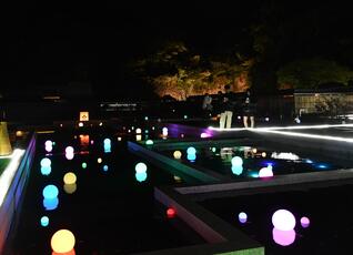 美しいもみじの紅葉と、園内の通路をライトアップし、流水園に、LEDボールを浮かべ、水面を漂う光で庭園を幻想的な空間に演出します。