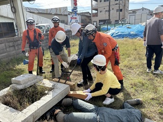 【救出訓練】倒壊した家屋からの救出を想定し、訓練します。