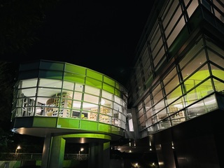 「こども本の森 松山」をオープン後、初のライトアップです。青りんごのオブジェにちなみ緑色にライトアップし、皆さんと祝福ムードを共有します。
