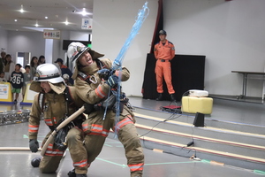 ・消火体験、ロープ渡り体験、ポンプ車からの放水体験、降雨体験、