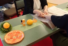みかんの香りのアロマオイルを使って、ハンドマッサージを無料で行います。
