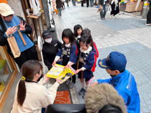 インバウンド対応で、園児たちが多言語標記のフリップボードを持って啓発するほか、外国人観光客が多く訪れる商店街の店舗を訪問し、多言語対応の防火パンフレットを配ります。