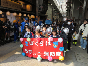 道後聖母幼稚園の協力で、園児が法被や防火服を着て、防火パレードで地域の安全を呼び掛けます。