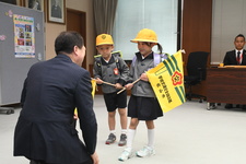 ランドセルカバーと集団登校旗を新入学児童に贈呈し、子どもたちに交通安全に関心を持ってもらうほか、登下校時に身に付け、ドライバーに注意を促し、児童の交通事故を防ぎます。