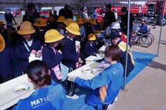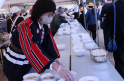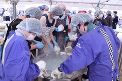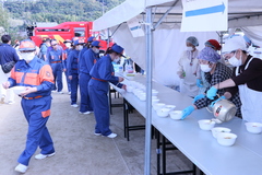 この訓練では、松山市女性防火クラブ連合会がうどんを調理し、参加者に配給しました。