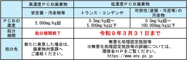 また、平成28年8月1日には、一部改正となった「ポリ塩化ビフェニル廃棄物の適正な処理の推進に関する特別措置法」等が施行され、処理期限は、以下のとおり定められていますが、詳細については、環境省ホームページをご覧ください。