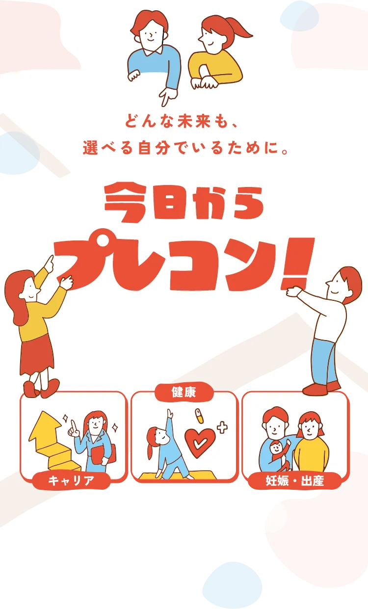 プレコン(プレコンセプションケア)は、若い男女が将来のライフプランを意識しながら、毎日の生活や健康習慣を見直す取り組みです。次世代を担う子どもの健康にもつながるとして、近年、幅広い世代から注目されています。 ※「プレコンセプションケアセンター(国立成育医療研究センター)」より引用