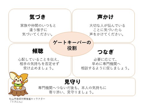ゲートキーパーとは、悩んでいる人に気づき、声をかけ、話を聞いて、必要な支援につなげ、見守る人のことです。