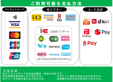 - 現金とクレジットカードなど複数の支払い方法の併用はできません。