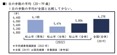 人によって1日の歩数はかなり違いますが、松山市民の1日の平均歩数は、全国と比較すると少ない結果となっています。