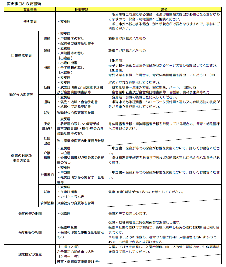 保育所等の入園申し込み後、下記の内容のようにご家庭の状況が変わった場合は、保育・幼稚園課へご連絡の上、下表に記載している必要書類を保育・幼稚園課または保育所等へ提出してください。