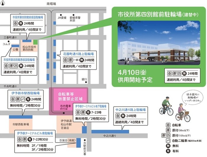 松山市駅周辺の自転車等放置禁止区域指定と市役所第四別館前駐輪場開設のお知らせ
