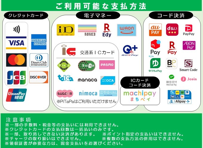 | 電子マネー | iD、nanaco、楽天Edy、WAON、まちペイ、QUICPay、マチカ マネー |