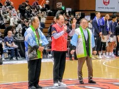 愛媛オレンジバイキングス マッチシティ「松山市の日」 愛媛オレンジバイキングスVS福井ブローウィンズの試合が行われ、試合開始前に挨拶をしました。