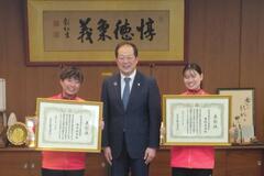 第25回夏季デフリンピック競技大会東京2025に出場し、金メダルを獲得した橋本樹里選手と栗林愛美選手の功績を称え、松山市文化スポーツ栄誉賞を贈りました。