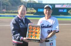 松山市で秋季キャンプを行っている東京ヤクルトスワローズの春季キャンプを訪問しました。東京ヤクルトスワローズ松山協力会からの記念品を贈り、選手の皆さんを激励しました。