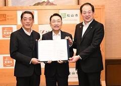 左から中村時広知事 、寺田健志代表取締役社長執行役員 、市長