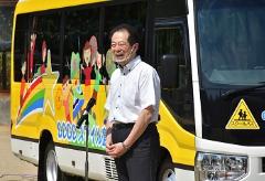松山市立興居島小学校の通学に使用するスクールバスが老朽化したため、児童が考案したデザインでラッピングした新しいスクールバス「GOGOスマイル島っ子号」を初めて運行するのに合わせ、お披露目式に出席しました。