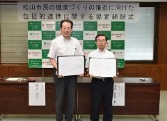 相互に連携や協力して、市民の健康的な生活を実現するため、全国健康保険協会愛媛支部と「松山市民の健康づくりの推進に向けた包括的連携に関する協定」を締結しました。