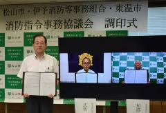 119番通報の受信や消防隊、救急隊の出動指令などを共同で運用する「松山圏域消防指令センター」を整備するため、松山市、伊予消防等事務組合、東温市で「消防指令事務協議会」を設立し、調印式をオンラインで行いました。