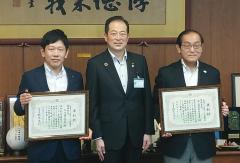 松山市健康づくり応援パートナーに登録された企業で、令和2年度に優れた活動やユニークな活動をされた帝人株式会社松山営業所とセキ株式会社を表彰しました。