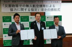大規模な災害が発生した場合に被災状況などの情報を収集し迅速に災害に対応するため、愛媛ドローン保安技術協会と「災害時等での無人航空機等による協力に関する協定」を、えひめドローン安全協議会と「災害時等での無人航空機による協力に関する協定」を締結しました。
