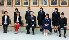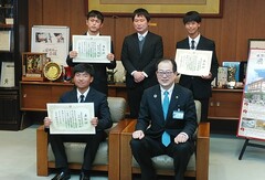 高校生ごみ拾い日本一を決める大会「スポGOMI甲子園2021」で優勝した愛媛大学附属高等学校1年の山村龍之介さん、臼坂奏音さん、長谷川喬一さんのきらめき松山市民賞表彰式を行いました。
