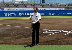 四国アイランドリーグplus(プラス)2022定期交流戦 愛媛マンダリンパイレーツ「松山市の日」愛媛マンダリンパイレーツVS福岡ソフトバンクホークス3軍の試合が行われ、試合前セレモニーに参加しました。