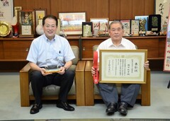 柔道界への多大な貢献で、柔道九段に昇段した棟田利幸氏の松山市文化スポーツ栄誉賞表彰式を行いました。