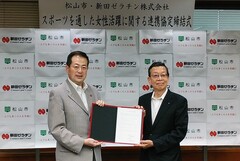 松山市で活躍する女性アスリートの競技活動を支援し、スポーツで女性が輝くまちづくりを進めるため、新田ゼラチン株式会社と「スポーツを通した女性活躍に関する連携協定」を締結しました。