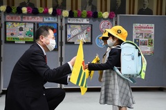 また、児童の交通事故を防ぐため、市長から新入学児童にランドセルカバーと集団登校旗を贈呈したほか、交通安全啓発ポスター入賞者の湯山小学校の5名を表彰し、さまざまな交通安全活動に協力いただいた令和4年度交通安全モデル園の学校法人高縄幼稚園認定こども園高縄幼稚園とモデル小学校の湯山小学校に、感謝状を贈呈しました。