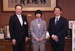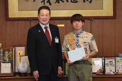 ボーイスカウトの最高位章の「富士スカウト章」を受章したボーイスカウト松山地区協議会隊員の田窪晃汰さんの表敬を受けました。