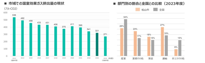 「地球温暖化対策の推進に関する法律」に基づき、松山市域で排出される温室効果ガスの排出状況や削減目標、削減に向けた取組などを定めた「第2期松山市環境モデル都市行動計画(区域施策編)」を2023年4月に策定しました。