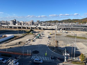 駅東側では、三番町線の下水道や上水道などの地下埋設物の布設が完了し、中央分離帯などの道路構造物の整備に取り掛かります。