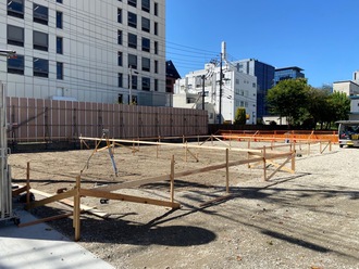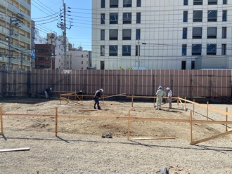 建物を正確に建設するため、位置や高さを計測し、杭や水糸などを使って、施工の基準を地上に定める作業「遣り方(やりかた)」を行っています。