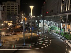 西側ロータリーの一般車乗降場の屋根の整備が完了しました。8月24日の新電停の利用開始に向けて、電停や線路の移設工事が進んでいます。