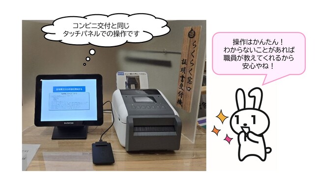 コンビニエンスストアなどのマルチコピー機と同じタッチパネルでの操作なので、コンビニ交付の便利さや操作の簡単さを実感してもらうことで、次回からはお近くのコンビニエンスストアで簡単に手続きできます。