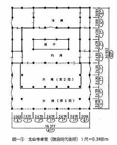 この建物の柱間寸法は2通りに分類されるが、1尺=0.3485mという尺度を当てはめると、それぞれ6.0、7.0尺に該当する(図3参照)。さらに6尺の柱間には12本の垂木が、7尺の柱間には14本の垂木が割り付けられる。この現象は先の「